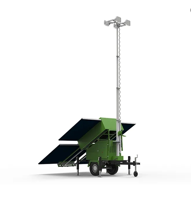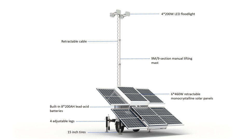 Robust Structure: Features a 9-meter, 9-section manual lifting mast, wind resistance up to level 8, and a trailer system with 15-inch tires and 4 adjustable support legs for stability and mobility.